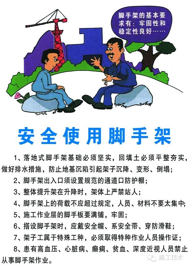 材料要符合要求;搭设应牢固可靠;升高后要绑防护拦杆,挂安全网最好有护身,兜底两层;脚手板要够宽;严防探头板;板上堆料不准超重、雨、雪后更要仔细检查,并采取有效的防滑措施。