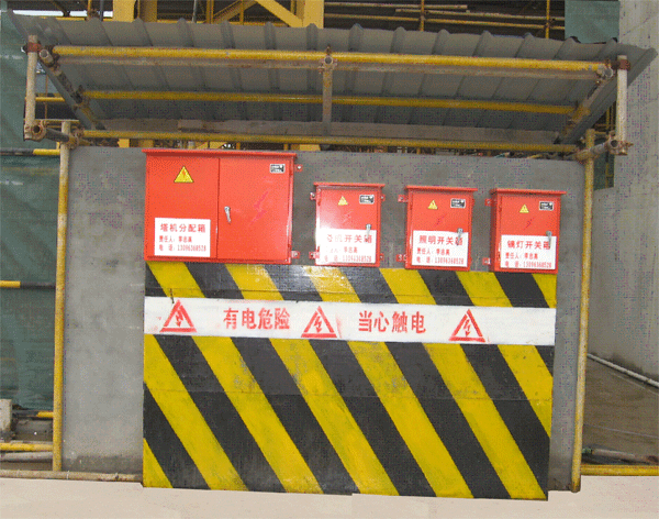 临时电线不破皮:一般“三火一零”四趟线;架线杆要直,不准以树或金属物代替;线距在地面4米以上;防水线不准有死弯,并必须绝缘良好;行灯36伏,金属器内照明12伏电压,手持电动机具的电源闸箱要装触电保护器,同时要带绝缘手套;电器开关闸箱需有盖、上锁;所有制机电设备和电闸箱要接地或接零。
