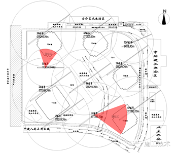 塔机的平面布置需尽可能覆盖整个施工场地,并且需覆盖到材料的装卸位置,不出现或少出现塔机不能吊装的盲区,以避免材料的二次搬运, 但是又需控制各塔机回转时的覆盖面应尽可能少重叠或不重叠。相邻塔机间应保证足够的安全距离,不出现塔机的前臂碰撞相邻塔机的塔身以及塔机的后臂碰撞相邻塔机的吊钩的情况。