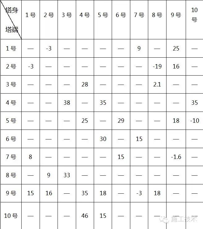 由于8,7号塔机分别同T2,T6塔楼平面位置冲突,不能满足塔机与建筑物之间至少2m的安全距离,本工程对8号和7号塔机均进行了回转限位。表1中①“—”表示两台塔机未相邻;②表中数据表示相邻塔机之间的最小距离;③2号与8号塔机的相对位置为8号塔机处于低位;5号与10号塔机的相对位置为10号塔机处于低位;7号与9号塔机的相对位置为9号塔机处于低位。④对塔身与塔端的距离不满足2m安全距离的塔机,将低位塔机设置回转限位。