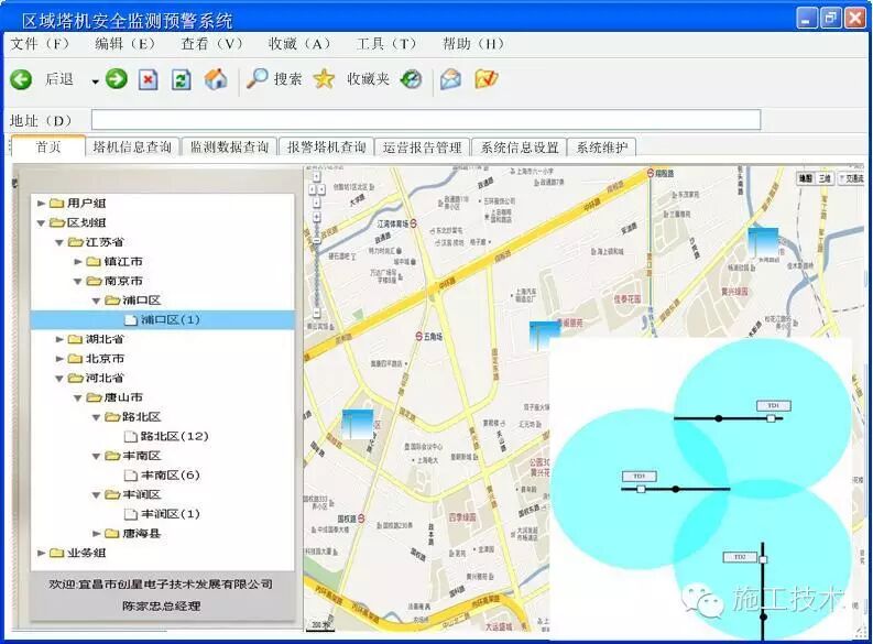 该群塔防碰撞监测系统由安装在塔机上的RJ-101型塔机安全监测仪、安装在施工现场办公室的RJ-103型塔机控制器以及安装在远程管理中心的RJ-104型塔机安全管理信息系统3部分组成。