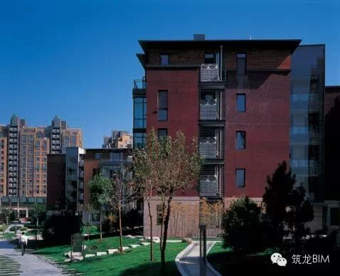 色彩:红砖在外,斜顶在上,屋顶为深灰色。空间灵活使用、流行自然,蓝、灰、绿富有艺术的配色处理赋予建筑动态的韵律与美感。