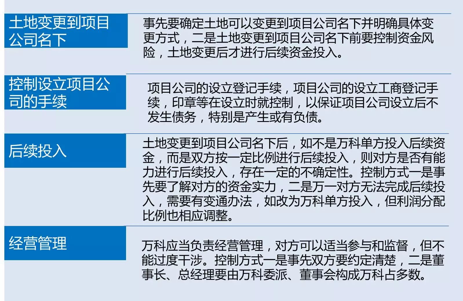 (3)股权并购可控原则:万科受让对方在项目公司中股权可以控制,同时事先需要对受让股权及其条件、价格等约定清楚。