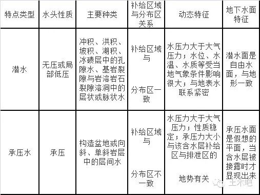 表1 潜水和承压水