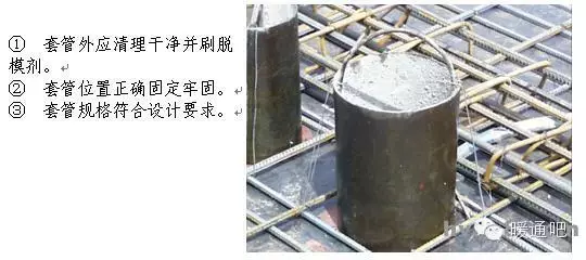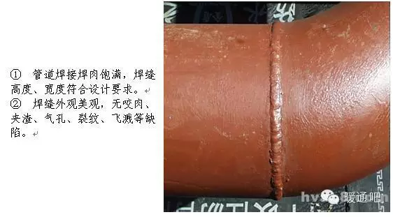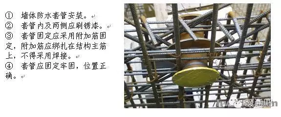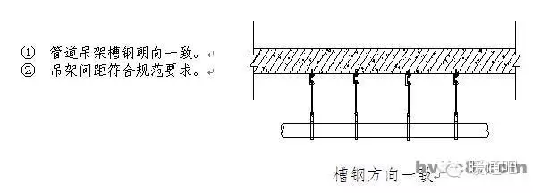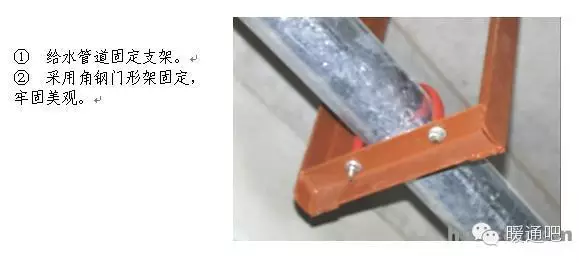 1.1 材料、设备进场检查要点 1. 材料要求总则 暖卫设备、钢材、管材、管件及附属制品等必须符合国家或部颁标准,并按有关规定具有产品出厂合格证明、复试检测报告、产品质量认证或生产许可证。 2. 材料要求细则 1 镀锌钢管:外观检查镀锌层良好、无锈蚀、无毛刺,壁厚均匀符合要求,端口无飞边。管件无偏扣、乱扣、丝扣不全或角度不准等现象。 2 焊接钢管及无缝钢管:壁厚均匀、无锈蚀、无飞刺、符合要求,端口无飞边。 3 铸铁管:目测顺直,壁厚均匀符合要求,内外光滑、无浮砂、包砂、粘砂,更不允许有砂眼、裂纹、飞刺和疙瘩。 4 阀门:规格型号和适用温度、压力要求符合设计要求,铸造规矩,无毛刺、裂纹,操作灵活。 5 设备应具有出厂合格证和质量证明书,并应符合设计要求或地方有关规定。进场时应做验收和按规定复验。 1.2 管道预留预埋要求 1.2.1. 给水、热水、排水(U-PVC管)、采暖、空调、消防及喷洒系统管道穿楼面、屋面及墙体均需设置套管。 1.2.2. 穿墙、楼板套管一般采用普通套管即铁皮套管和钢套管以及塑料套管,如设计无规定,宜优先选用钢套管。 1.2.3. 穿墙套管应保证两端与墙面平齐,穿楼板套管应使下部与楼板平齐,上部有防水要求的房间及厨房中的套管应高出地面50mm,其它房间应为20mm,套管环缝应均匀,用油麻填塞,外部用腻子或密封胶封堵;当管道穿越防火分区时,套管的环缝应该用防火胶泥等防火材料进行有效封堵。 1.2.4. 钢套管内外表面及两端口需做防腐处理,断口平整。 1.2.5. 镀锌铁皮套管要卷制规整,采用咬口连接,严禁采用非咬口、搭捆在穿管表面。否则将失去套管的作用,使维修换管时困难,且受温度作用时,限制了自由伸缩,导致管道额外受力,甚至将墙面抹灰层拉裂。 1.2.6. 预埋套管不得与结构钢筋焊在一起,应用附加钢筋固定,确保普通套管与墙体宽度一致,通风及柔性防水套管符合设计及规范要求。 1.2.7. 管道和设备安装前,必须清除内部污垢和杂物,安装中断或完毕的敞口处,必须临时封闭。临时封闭管口的材料,应采取不易被破损的措施,如短管丝堵、铁皮扣碗。 1.2.8. 楼板预留洞要求 1 预留洞位置正确,洞口大小符合设计及规范要求。 2 使用钢模盒应清理干净,外刷脱模剂。 3 套管固定应牢固可靠,采用三点固定方法。 4 控制出模时间(出模时间根据土建要求为准),过早将产生洞口塌陷,过晚将给出模造成困难,破坏洞口的完整性。 5 浇筑混凝土时应有专人看护,保证预留、预埋孔洞应无位移、跑偏歪斜等现象。 1.3 管道支吊架安装 1.3.1 管道支、吊、托架安装应符合下列规定 1 位置正确,埋设平整牢固。 2 与管道接触应紧密,固定应牢靠。 3 滑动支架应灵活,滑托与滑槽两侧间应留有3~5mm的间隙,并留有一定的偏移量。 4 无热伸长管道的吊架、吊杆应垂直安装,若吊架、吊杆上为槽钢则槽钢朝向应一致。 5 有热伸长管道的吊架、吊杆应向膨胀的反方向偏移。 6 固定在建筑结构上的管道支、吊架,不得影响结构的安全。 7 钢管水平安装的支架间距按表3-1执行(在设计无特殊要求的前提下):