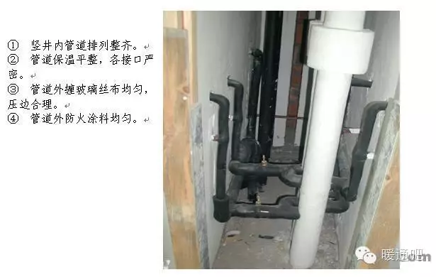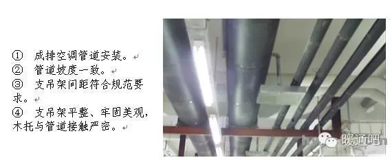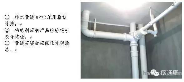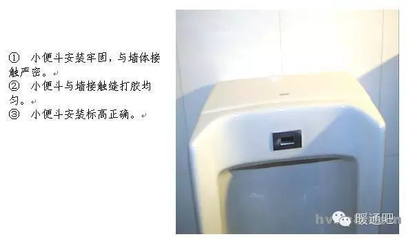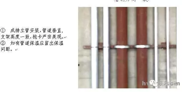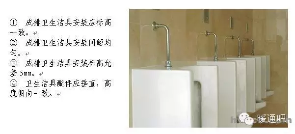 立管管卡安装,层高小于或等于5m,每层安装1个;层高大于5m,每层不少于2个。管卡安装高度,距地面1.5~1.8m,2个以上管卡可以匀称安装。 9 消防喷洒管道末端应加防晃支架,防晃支架距末端喷洒头距离为不大于750mm不小于300mm。 10 管道支架安装不允许出现半明半暗现象。 11 有瓷砖或石材的墙面安装管道支架,支架应安装在瓷砖或石材的缝隙处。 12 管道支吊架距焊口距离不得小于50mm。 13 悬吊式空调管道长度超过15m时,应加防摆动固定支架。 14 塑料管道以及铜管应按照塑料管和铜管的要求进行安装。 15 塑料管道用铁支架固定时,应在管道和支架间垫上3mm的橡胶垫。 16 不锈钢和铝管支吊架不得直接和铁支架接触,应在之间垫相应的材料或橡胶垫。 17 空调(风、水)管道支吊架应有隔热材料(木托)并采取措施固定在支架上,隔热材料的厚度不得小于管道保温层厚度。 18 机房内和明露部分的管道吊架对型钢进行坡角处理。 19 管道支吊架安装方法。 1.4管道竖井管道布置 1 管道竖井布置应合理,管道间距合理。 2 管道阀门安装高度应便于操作。 3 排水管检查口朝向应便于检修。 4 管道穿楼板处,除排水管外均应加套管。 5 管道保温应均匀,平整。 6 管道支架布置合理,成排管道应安装在同一个支架上。 u 1.5 管道安装节点控制 1.5.1.管道丝扣连接 丝扣连接管道,螺纹清洁、规整、无断丝,镀锌钢管和管件的镀锌层破损,接口处无外露油麻,外露丝扣2~3扣。 1.5.2. 法兰连接 1 法兰对接平行、紧密,与管子中心线垂直,双面施焊,法兰螺栓应长短一致,朝向相同,螺栓露出螺母部分应为螺栓直径的一半。 2 法兰连接螺栓紧固时,按对角进行紧固,使法兰之间缝隙均匀。 3 法兰不得直接焊在弯管或弯头上,一般至少连接在长度100mm以上的直管段。 4 法兰与法兰连接应保证垂直度或水平度,使其自然吻合,以免管道或设备产生额外应力。 5 支管上的法兰距主管外壁净距应在100mm以上,过墙管道上的法兰与墙面净距为200mm以上。 6 法兰连接组对时,垫片应放在法兰的中心位置,不得偏斜,除设计要求外,不得使用双层、多层或倾斜形垫片。 1.6 卫生洁具安装要点 1.6 .1 卫生器具的固定件应采用预埋件和膨胀螺栓,凡是固定卫生器具的螺母,垫圈均应使用橡胶垫,膨胀螺栓只限于混凝土板、墙,轻质隔墙及砖墙不得使用。 1.6 .2 座便器地脚螺栓不得小于M6,便器背水箱固定螺栓不小于M10,螺母下面须用平光垫和橡胶垫(3mm),螺栓外露螺母长度应为螺栓直径的一半。 1.6 .3 洗脸盆和家具盆支架安装必须牢固,器具与支架接触紧密,不得使用垫块的方法调整标高,各类支架均应做好防腐及面漆。 1.6 .4 器具下水管与排水管连接处应用油麻和密封胶或玻璃胶封严。 1.6 .5 浴盆的周边与墙面接触的部位应用玻璃胶封严。 1.6 .6 地漏水封深度不得小于50mm,地漏篦子顶面应低于设置处5mm。 1.6 .7 生洁具安装过程中应注意排水口的及时封堵。 1.6 .8 洁具安装后交工前,洁具成品保护措施到位,无划痕、破损、掉、裂痕、五金配件齐全,无丢失损坏,使用通畅、无漏水、堵塞等现象。  | ||||||||||||||||||||||||||||||||||||||||||||||||||