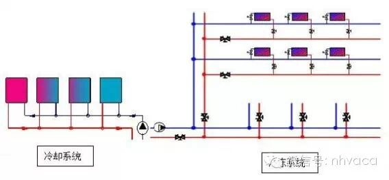 (备注:两管制系统是指输配系统在夏季供冷和冬季供热时都仅有一套管路,适合国情,经济-是现在的主要应用,因此两管制系统主要用于夏、冬季节性供应空调,在春、秋时需对空调进行切换;四管制系统是指供热和制冷各有一套输配系统,在很大的项目中,由于从楼外立面到楼内部可能进深很长,会出现冬季时,楼内部核心区很热,需要制冷,而夏季时,楼内部核心区可能需要供冷,所以四管制系统一年四季均有冷热供应,适应于超级大项目以及全年均须供应空调的场所,项目初始投资高。)
