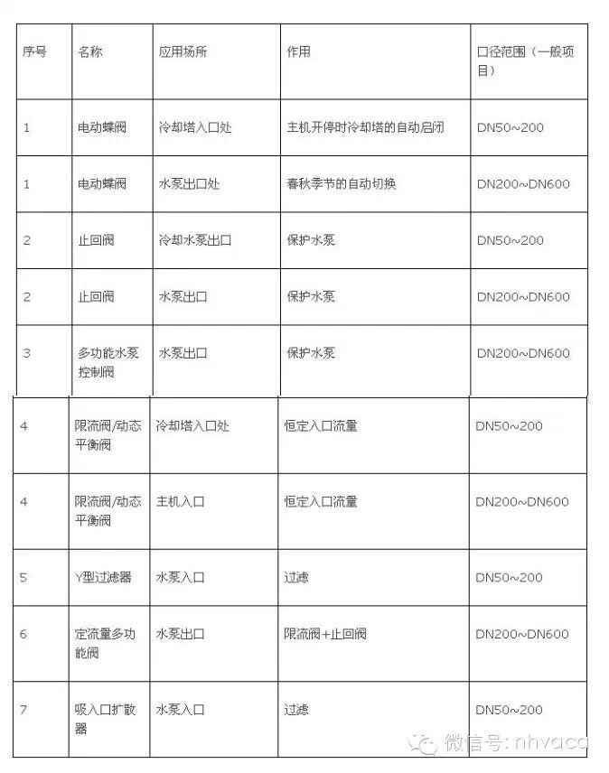 由于一次泵站采取主机—水泵—冷却塔的一一对应,同时一般高层建筑一次泵流量很大,所以,在一次泵站,主要使用到水泵出口的大口径止回阀、电动蝶阀(用于两管制系统春秋季节制冷或供热的自动切换,详见备注)、动态流量平衡阀、定流量多功能阀和吸入口扩散器、Y型过滤器或自动反冲洗过滤装置。
