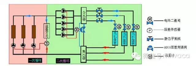 主机、一次水泵和冷却塔是一一对应关系:一台主机配置一台一次水泵,配置一台冷却塔。一次泵系统独立构成一次循环也叫一次循环,一次循环也可分为定流量和变流量两种系统。定流量一次泵系统肯定不节能,主要用在楼层低的小项目,我们不讨论;变流量一次泵系统通过压差旁通管路实现主机侧定流量,用户侧通过安装电动二通阀实现变流量,因此:主机和一次水泵为定流量运行,节能是通过用户侧流量的变化由自控系统调节主机和水泵运行台数来实现的。