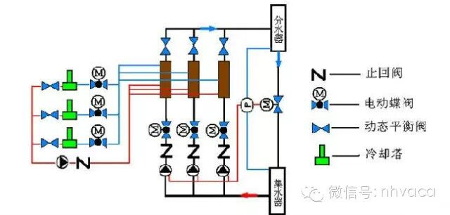 5、在冷却塔处应强力建议设计院选用电动蝶阀,如果随主机台数的关闭,冷却塔不能同时关闭,会造成能量的浪费,同时冷却效率下降;选用动态平衡阀,也更好的提高冷却效率。