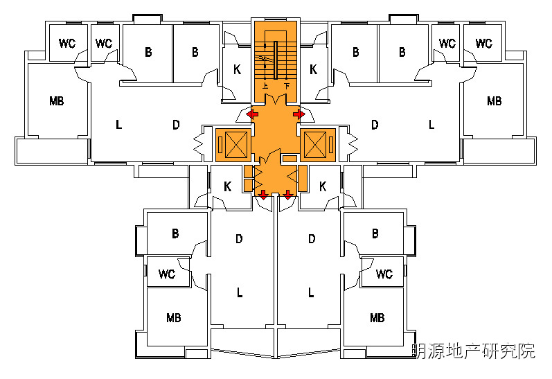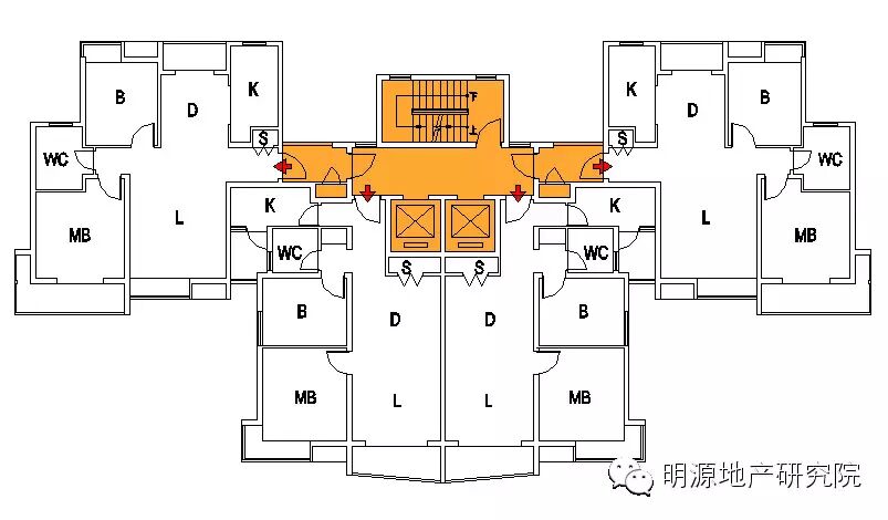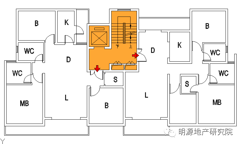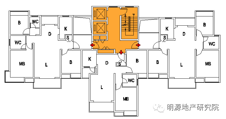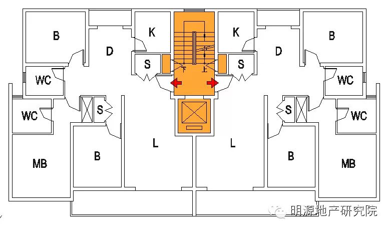 b.候梯厅北侧被楼梯间阻挡,采光通风稍弱