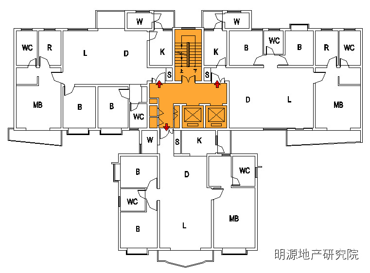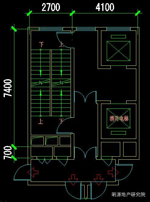 c.楼梯、电梯的上下布置充分利用进深,节约了面宽;