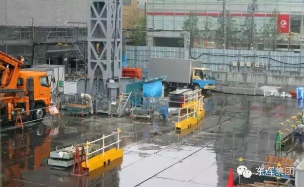 日本施工现场临时路面一般采用20MM厚钢板连续铺设而成,适合各类大型设备机械行走。钢板可周转使用,节约成本,另外也便于现场冲洗清洁。现场的施工道路分隔、指示醒目有序,让人清晰了然。