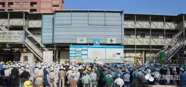 在日本,一个上部进行主体结构施工、下部进行装修施工作业的项目而言,总体的施工人数能够达到400—500人以上。如何针对这么多施工人员进行全员交底?日本的工程管理有一个非常好的“早会制度”。日本工地现场都会在办公区前设置一个相对宽敞的场所,用于集中工地所有员工进行集中交底式的会议。每天早上7:30分—8:00,这里就是工地现场的最高指挥部——项目部要向工地所有参建单位、所有当天在工地的人员,详细的阐述当天所有的施工内容和注意事项。