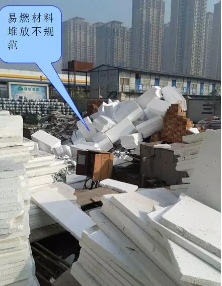 6.易燃材料堆放应规范 依据《建筑工程施工现场消防安全技术规范》(GB50720—2011)6.2.2可燃材料及易燃易爆危险品应按计划限量进场。进场后,可燃材料宜存放于库房内,露天存施时,应分类成垛堆放,垛高不应超过2m,单垛体积不应超过50m²,垛与垛之间的最小间距不应小于2m,且应采用为燃或难燃材料覆盖;易燃易爆危险品应分类专库储存,库房内应通风良好,并应设置严禁明火标志。