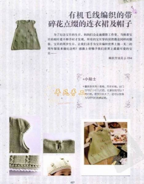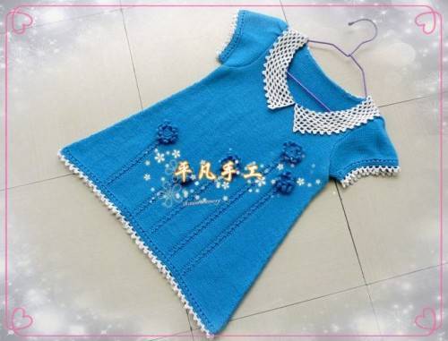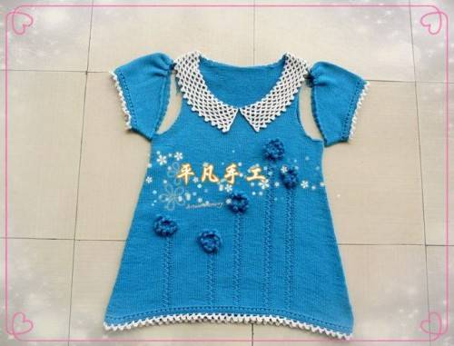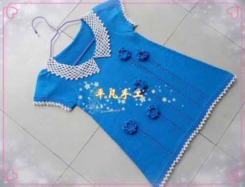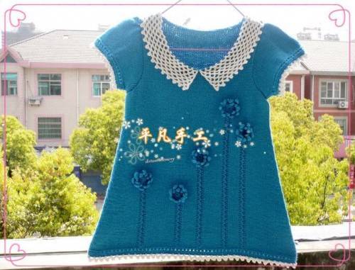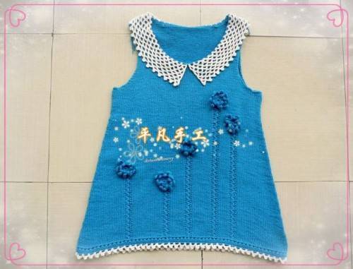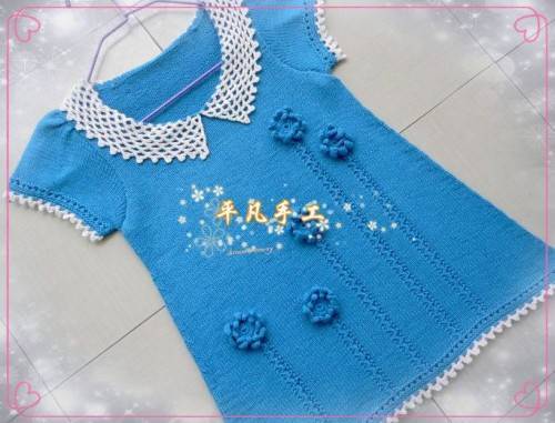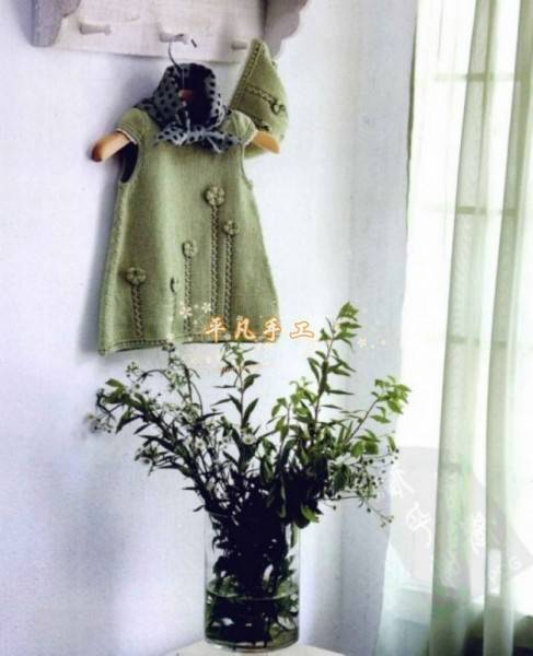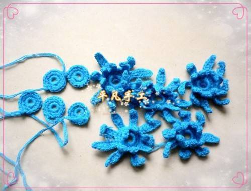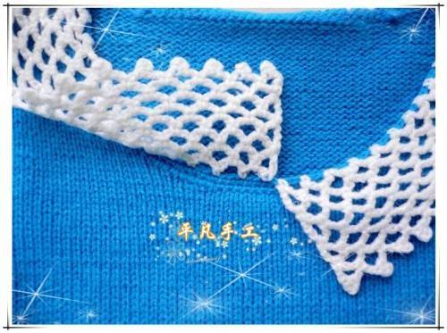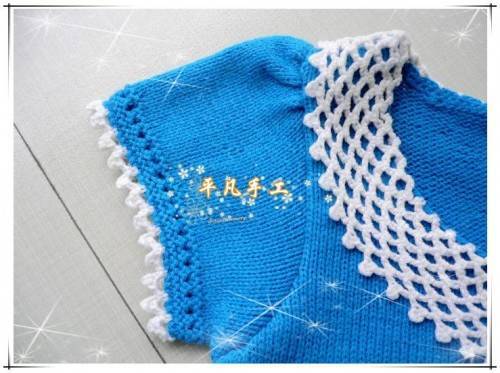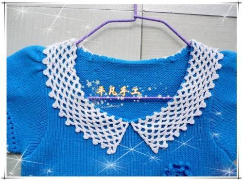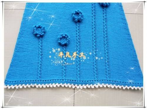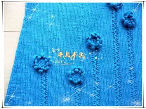 5、钩5朵花,缝在前片花茎上,衣边、袖口边用钩针修边。