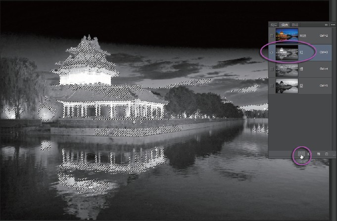 经常有朋友在这一步用鼠标单击RGB通道前边的眼睛图标,这样只是让3个通道可见,但并没有打开3个通道,这样做是不对的。必须打开3个通道,在通道面板上看到3个通道都处于激活状态。