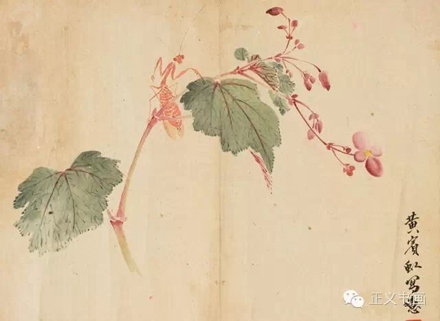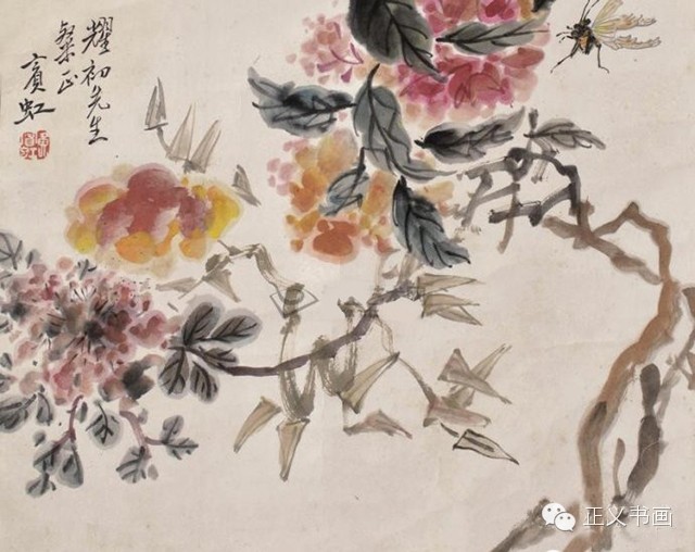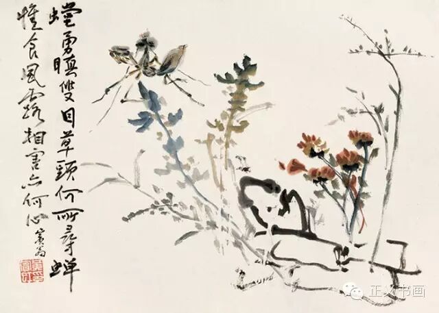 黄宾虹85岁由北平南返杭州前后,花鸟作品呈现出烂漫秾丽的特质;到了晚年,丰润厚实而融洽的笔墨和设色,让此阶段的的花鸟画愈发古厚,此时依旧用那秾丽烂漫的笔调,作那一路具海上画风的大笔写意,只是在花草丛中总有一两只神气活现的翠衣螳螂或憨憨的红衣小甲虫。笔墨之苍老,情态之童真,真所谓“水流花放之妙”,“妙在自自在在”。