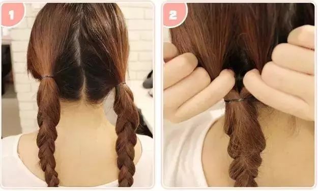 先编好左右两只辫子,在橡皮筋上方拉出一个小洞