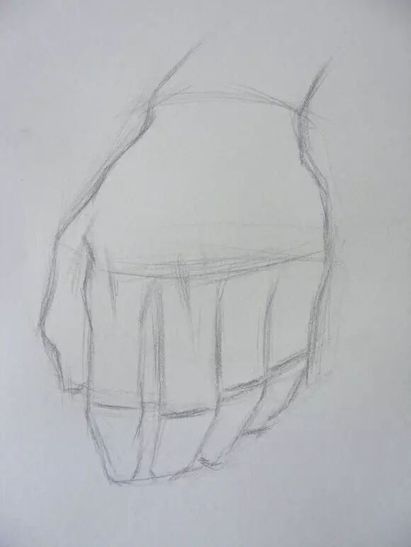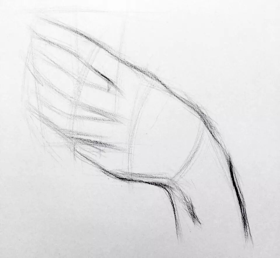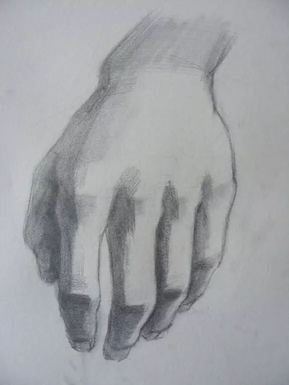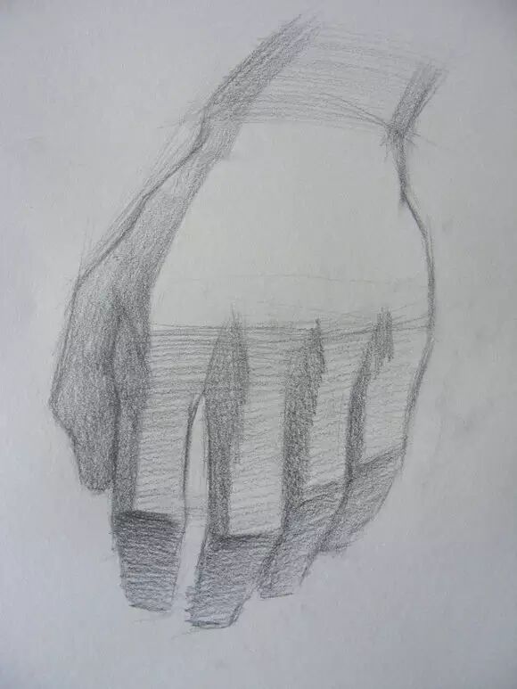 2/6 手部结构比较复杂,呈现出来的起伏非常多,这一步不必关注太多细节,把手部大的块面找出来,分出大的黑白灰,抓住块面之间明暗转折,适当刻画出转折部分的手部的细节,比如手指的关节骨点。