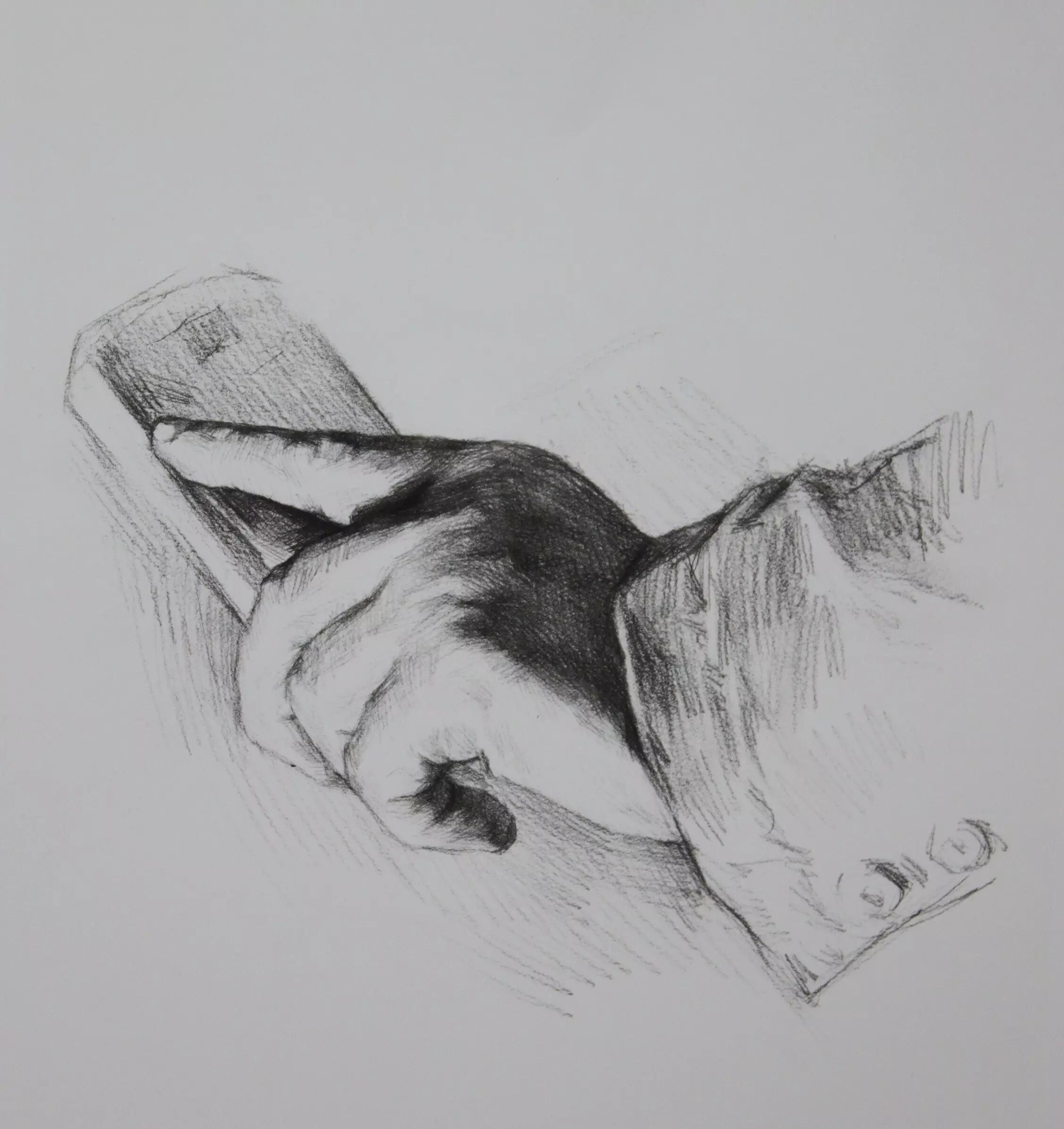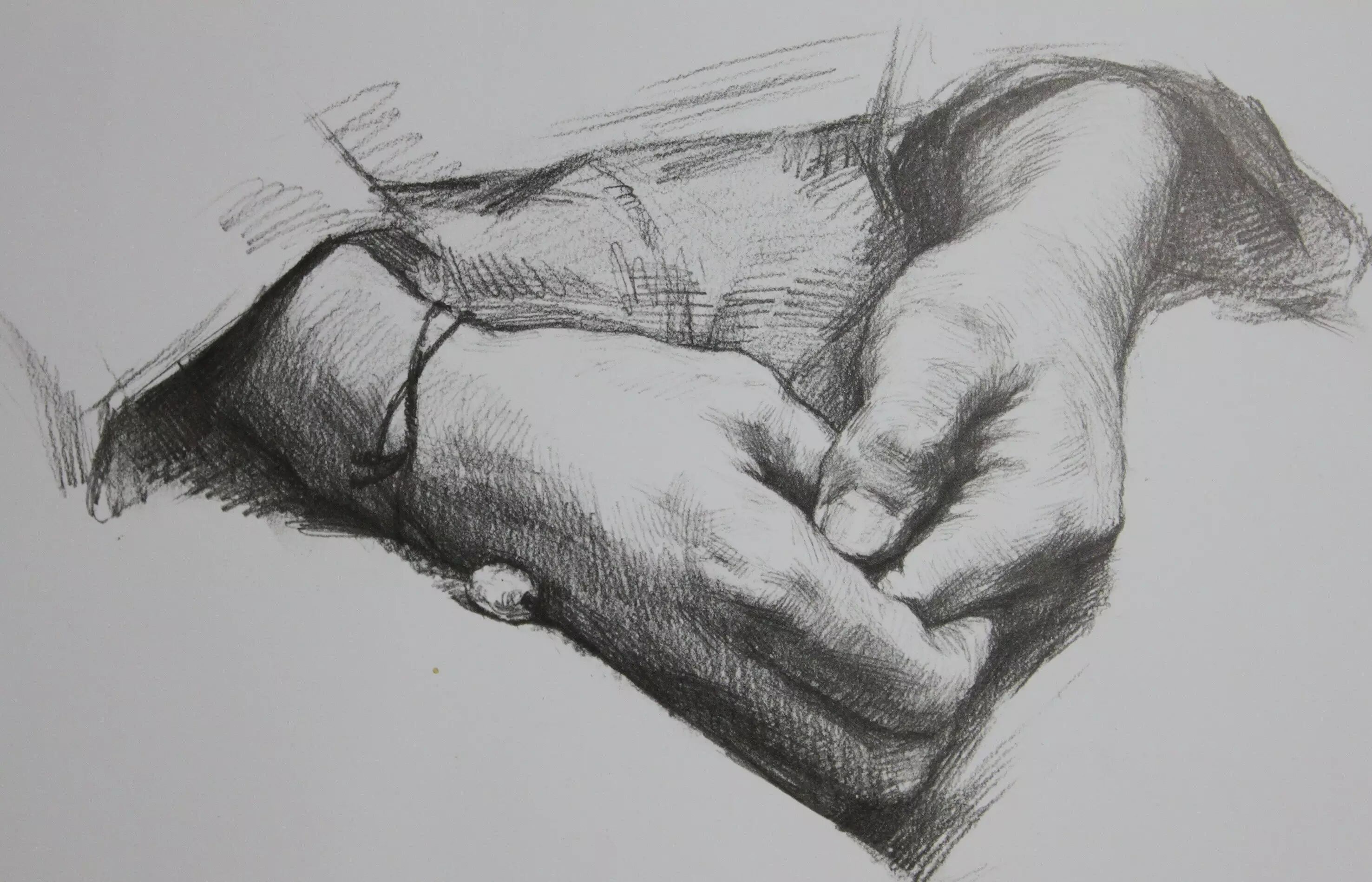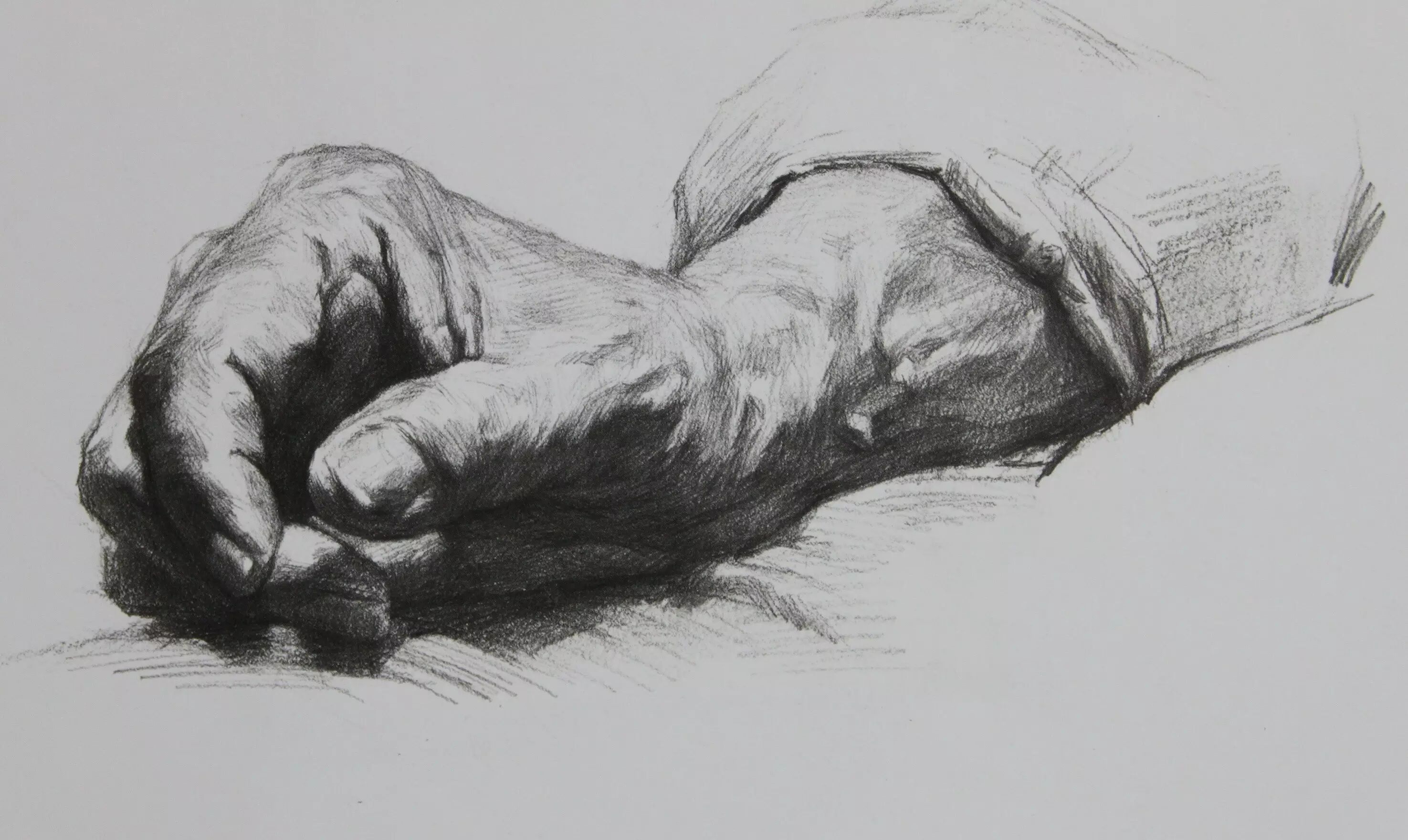 刻画这些精彩地方时,应该多换铅笔去画,关节的刻画要注意,它是 一个体块的隆起,找出隆起的部分的暗面和灰面。这里的小调子画得要干净利索,这样画面就出精彩。
