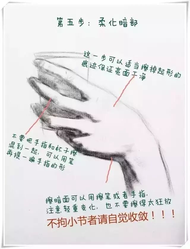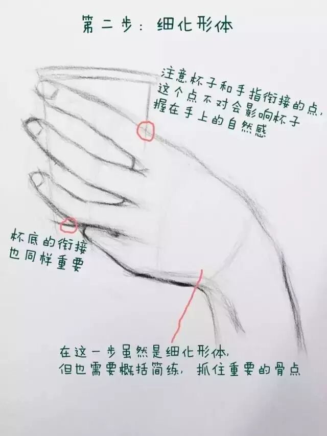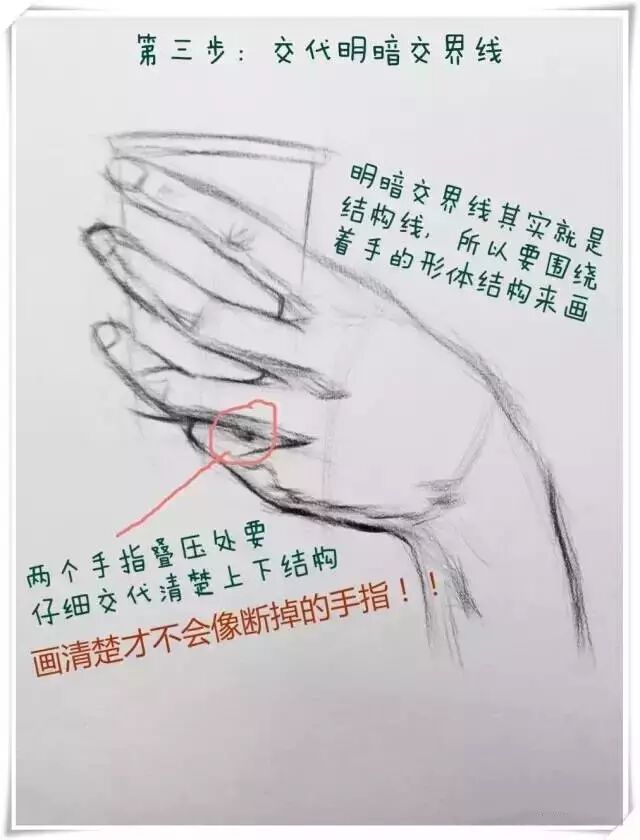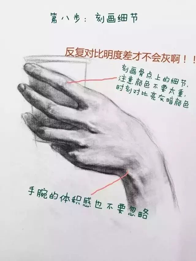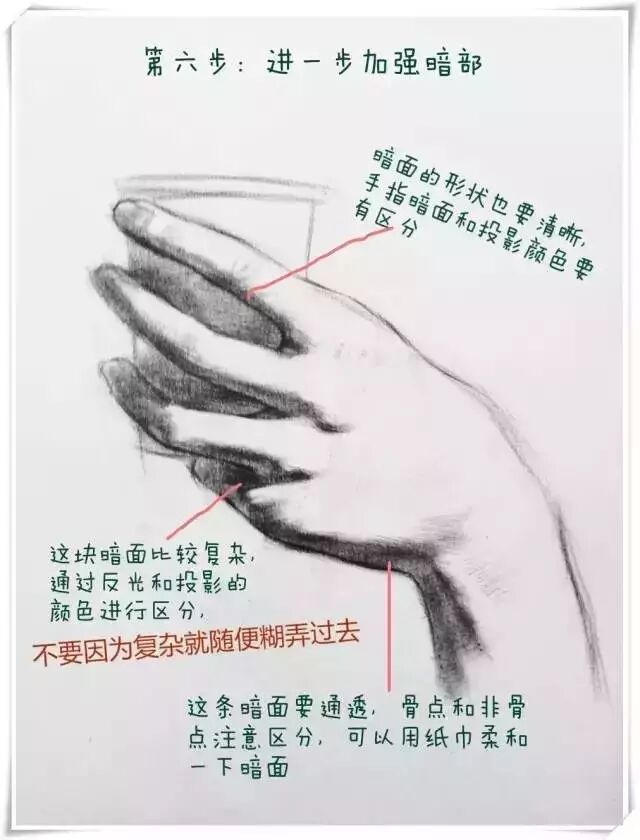 5/6 到了这一步就是重点刻画了,也就是整张手部画面的视觉中心在那,那里就是刻画的重点。这个手部姿态刻画重点在食指和中指关节。