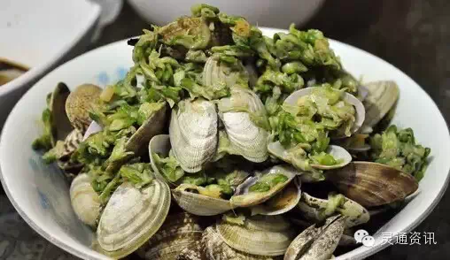 4、再过1—2分钟后,蛤蜊全部张开口,倒入剩下的槐花,翻炒,加盐调味后即可出锅。