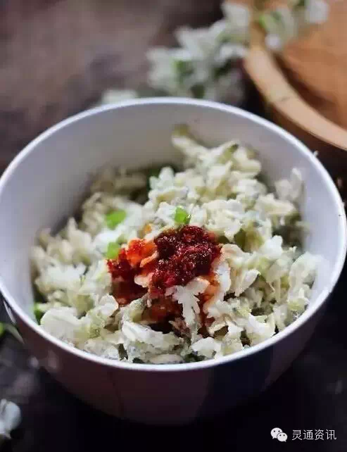 2、槐花焯水过凉,挤干水份,与肉馅拌均。