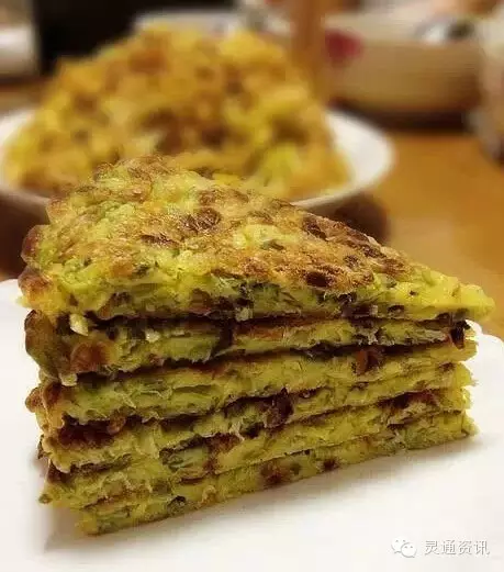 2、不粘锅中加油,倒入搅好的糊,用勺子压平,定型后翻面再煎,至两面金黄便可出锅啦!