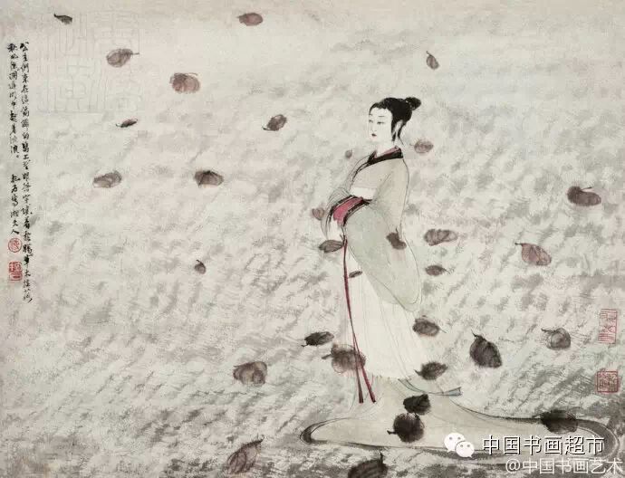16.《湘夫人》为傅抱石所作屈原《九歌》组画之一。此画中的湘夫人体态颀长,面目丰腴,仪态端庄,似有唐以前仕女风貌,高古游丝描般的衣纹劲健飘逸,色彩淡雅,明净高洁。湖水中的波浪为画家特创的笔法,与飘落的秋叶相衬托,深得“袅袅兮秋风,洞庭波兮木叶下”之意境。徐渭行书《花卉图卷题诗》