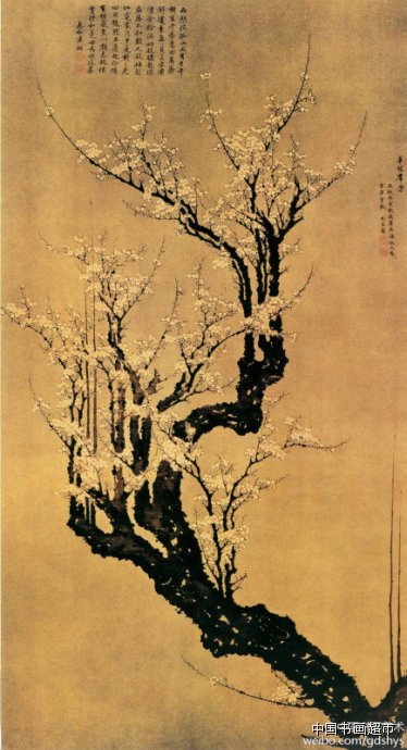 36.此图写一千老梅,干上新枝茁壮,花蕊繁密,犹如万玉缀枝。用顺逆有势的散锋笔皴写枝干,笔力雄逸,有苍龙出岫之势;梅花勾瓣点蕊,缜密枝头,冷艳奇丽,与粗悍的干身相映,苍劲中透出清气,表现出老梅神清骨峻的风姿。