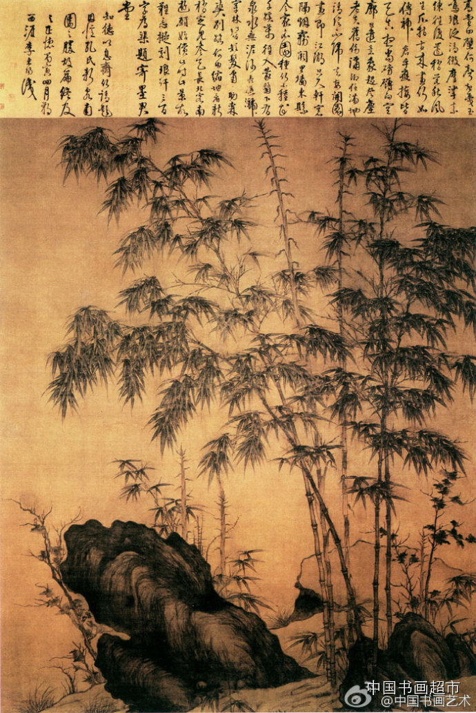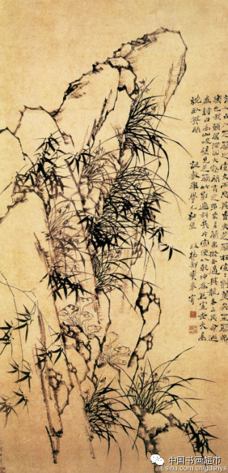 23 .加思,大叶长竿信笔为。但恐吟堂霜月夜,老鸦来踏受风枝。”简短四句诗,表现出画家豪放不羁的情怀。画面可谓精当简洁,湖石瘦而透,出于随意变化的湿而整的笔致,修竹新篁,笔意隽逸。郑板桥《兰竹图》