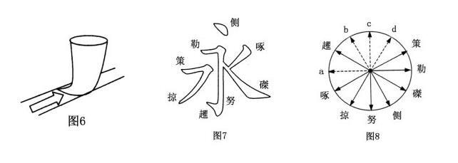 如图8所示是永字八个笔法侧、勒、努、趯、策、掠、磔、啄所代表的八个笔画方向,在此图中a、b、c、d四个方向永字八法中没有,在楷书中可以说这四个用笔方向也是没有的,就是说,永字八法的八个点画方向代表了楷书点画的用笔方向和取势。就八面出锋的角度说,楷书中的八面出锋,可以界定为策、勒、磔、侧、努、掠、啄、趯的八个面出锋,从这一点说,李阳冰所说的“备八法之势,能通一切字”就有道理了,但关健还在于八面出锋。