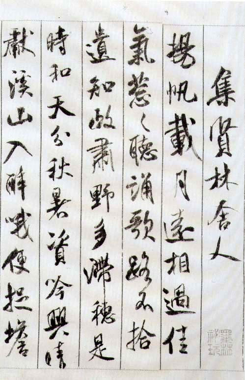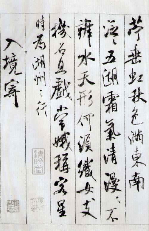 松竹留因夏,溪山去为秋。久赓白雪咏,更度采菱讴。缕会(此字误书旁注卜乃点去符号)玉鲈堆案,团金橘满洲。水宫无限景,载与谢公游。