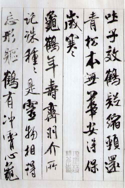 对于藏锋,古人重视,论述也多,如蔡邕说:“藏头护尾”,王羲之说:“第一须存筋藏锋,灭迹隐端”。又说:“用尖笔须落笔混成,无使毫露,所谓筑锋下笔,皆令完成也。”徐浩在《书法论》中说:“用笔之势,特须藏锋、锋若不藏,字则有病。”这些都是强调藏锋是写字的重要笔法,历来有人对它作了种种比喻:如锥画沙、如印印泥、如屋漏痕、如折钗股、如壁圻等等。似乎能用藏锋就等于掌握了笔法规律。显然藏锋只不过是笔法技术之一,应该说它也不能代表总体的笔法规律。宋人姜夔首先提出了不同意见,他在“续书谱”中说:“用笔如折钗股、如屋漏痕、如锥画沙、如壁圻,此皆后人之论。折钗股者,欲其屈折圆而有力,屋漏痕者,欲其横直匀而藏锋。锥画沙者,欲其无起止之迹。壁圻者,欲其无布置之巧。笔正则锋藏,笔偃则锋出,一起一倒,一晦一明,而神奇出焉。常欲笔针在画中,则左右皆无病矣,故一点一画,皆有三转,一波一拂,又有三折。”他在这段话里,明确指出了藏锋虽然要用,但不是究竟的笔法(不是用笔的原则,不是用笔的指导思想)。