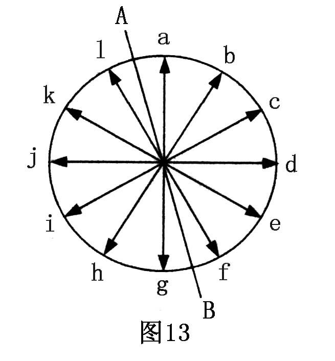 在实际书写过程中,八面出锋是一个指导性原则,有时也可以简化,即将笔锋的四周各面简化成左右两个面。如图13所示,如我们将笔锋的运笔方向分为a、b、c、d、e、…… k、m12个方向, 但我们以AB为轴线将笔锋刮扁(这样适用于右手书写),AB线左侧即为左面,右侧即为右面。这时,凡向AB线左侧书写的线都用左面,即不管是k方向还是g方向,都用左面。凡向右侧书写都用右面,即不管是d方向还是f方向都用右面。这样,笔锋的使用就更容易掌握,尤如使用一把排刷,只根据书写方向的改变而相应使用刷子的左右二面。