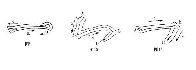 转是圆转,折是方折,不管是转是折,都要转换用笔方向。随着笔画方向的改变,锋面也要随之转换。如图10的笔画,运笔至 B点,要转变运笔方向,这时,使用的锋面也要从c面转换到h面。由于是迅速转换方向的方笔,转换锋面要用翻转,即所谓的翻笔。当运笔从BC段转到CD段,锋面又要从h面转换到d面,这一次在c处的转换锋面是慢慢的圆转,是随着用笔方向的慢慢改变,锋面也在相应的慢慢随之改变。这种转换锋面,叫做圆转。不管是方折还是圆转,都要随着运笔方向的改变而相应转变笔锋的锋面。