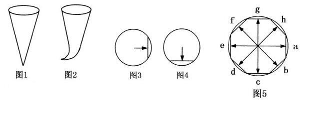 一般来说在正锋情况下,我们向哪个方向书写,就要用笔锋锥体的哪个侧面。假设汉字笔画方向向四周各方都有,那么我们就要用到笔锋锥体的四周各面。为便于解说,我们暂且将四周各方分为a、b、c、d、e、f、g、h八个方向,那么我们就要用到笔锋锥体的a、b、c、d、e、f、g、h八个侧面(图5)。这就是所谓的八面出锋。它的意思并不单一指这八个侧面,而是说要用笔锋锥体的四周各个侧面。