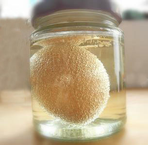 ② 取一枚鸡蛋洗净,浸泡在醋里。经过24~48小时,蛋壳便全部溶解。