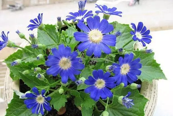 瓜叶菊科草本植物。瓜叶菊的颜色很多,其中以红色最为常见,南方街道上经常看见以红色瓜叶菊为盆景的景色。或许因此很多人都不知道,其实瓜叶菊还有罕见的蓝色的,艳丽的蓝色瓜叶菊是笔者十分喜爱的花之一。