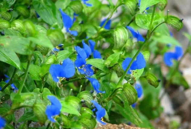 鸭跖草为一年生草本, 喜欢在潮湿的草地生长, 叶形为披针形至卵状披针形, 叶序为互生, 茎为匍匐茎, 花朵为聚花序, 顶生或腋生, 雌雄同株, 花瓣上面两瓣为蓝色, 下面一瓣为白色, 花苞呈佛焰苞状, 绿色, 雄蕊有6枚。