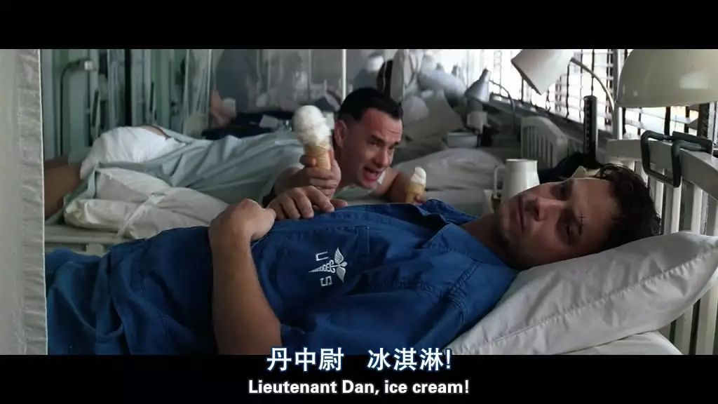 当长官拖着被截肢的残体,从此开始自暴自弃的人生时,阿甘却能在屁股中弹后,躺在战地医院的病床上,一人舔着两支冰淇淋(有一支是受伤的长官没心情吃,他给吃了),大快朵颐,享受一个光荣受伤的战士的疗伤福利。你看,傻瓜就是如此没心没肺,听天由命,简单快乐。