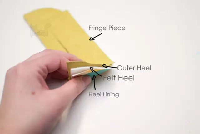 脚后跟位置,里布+铺棉+表布+ 一片长方形装饰布料,还需要加一层包边条。
