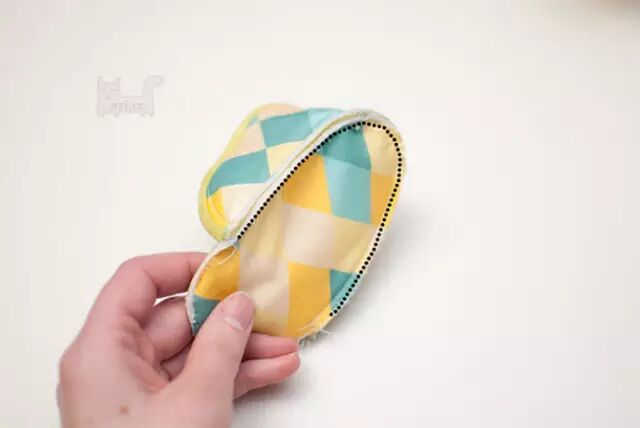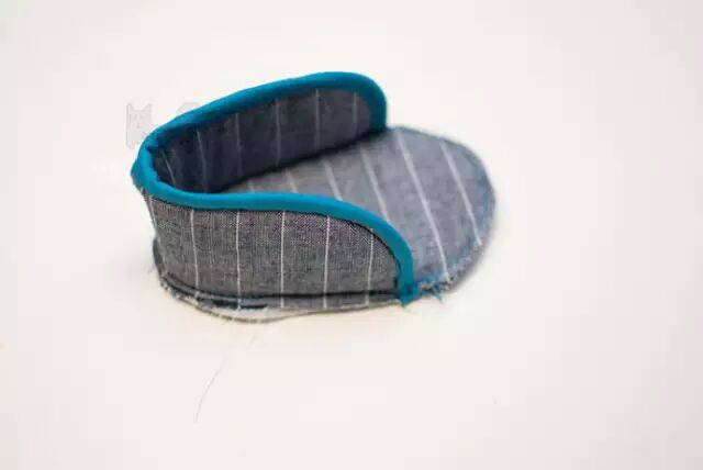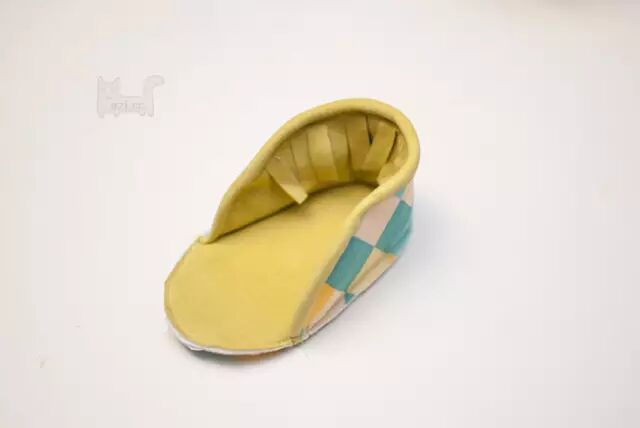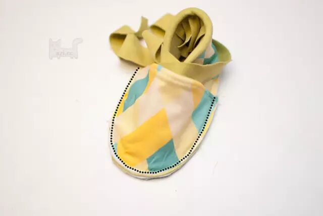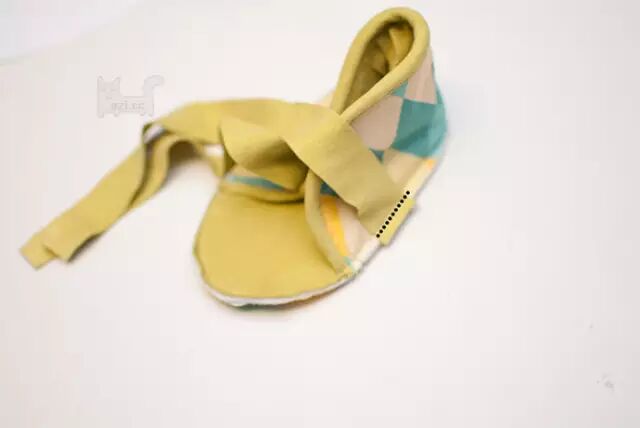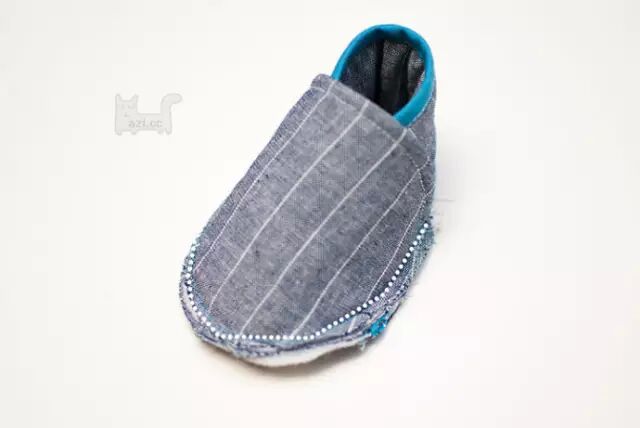 鞋面和鞋底中心点对齐,车缝。现在看到的是鞋子里面,车缝位置包边,不要磨到宝宝的脚丫。