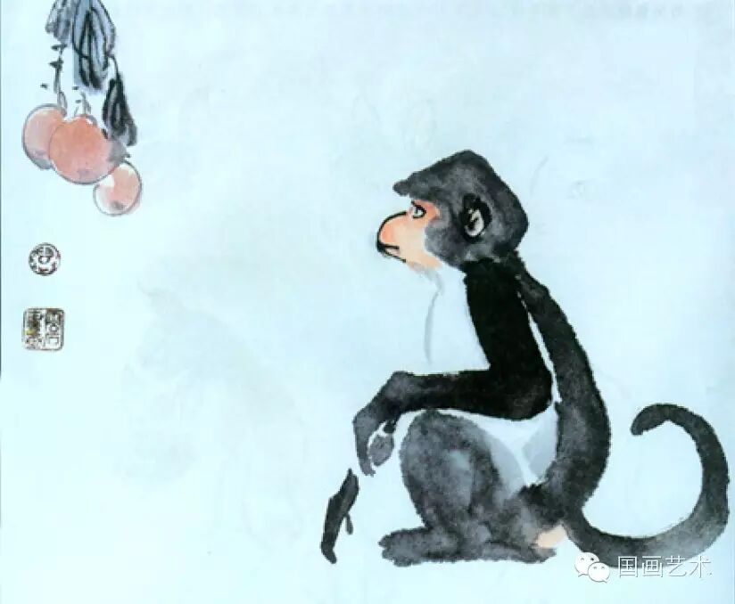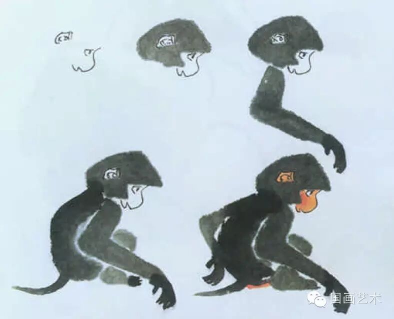 5.调淡墨画出内侧前肢,用朱砂染脸、耳和臀部。