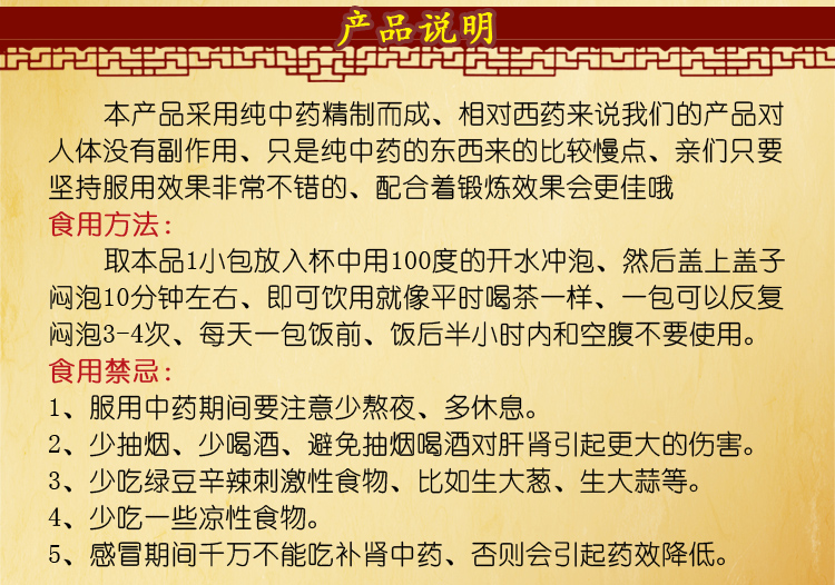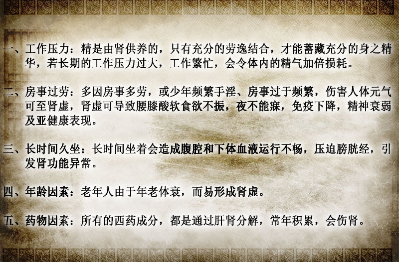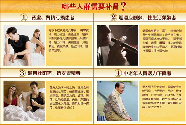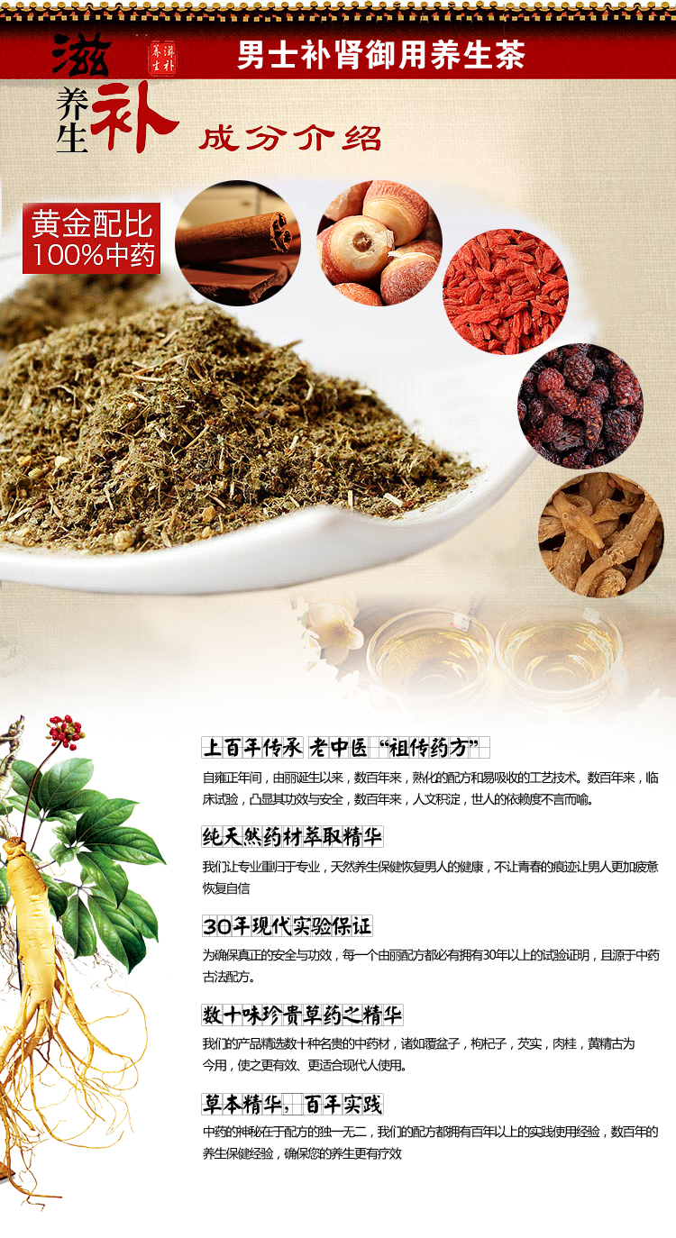<本草纲目>记载:肾主水,肾虚则导致水的代谢与运输不畅,血液循环受阻。肾藏精,经血同源。补肾,古法秘制养肾茶适用于:阴虚阳亢,欲望特别强,而结合时间短,自慰过多,早泄无力,记忆力下降者以及肾精亏损的各类人群。