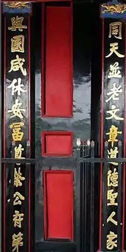 错字:与国成休安富尊荣公府第,同天并老文章道德圣人家——上联中的“富”字少上面一点,宝盖头成了秃宝盖。下联中的“章”字下面的一竖一直通到上面。