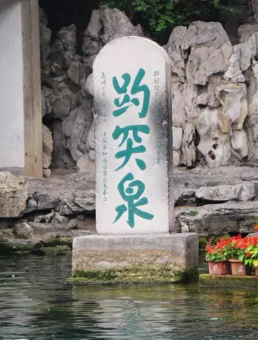 典故:在济南府“趵突泉”,泉池中有块半浸水中的石碑,上镌三个雄健大字——趵突泉,这是明代山东巡抚胡缵宗所写。