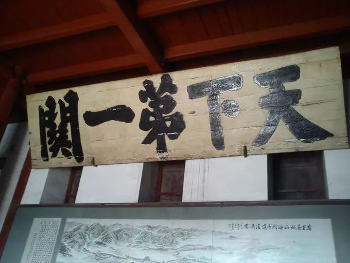 典故:此匾乃明代著名书法家萧显所书。其匾长5米多、高1.5米,每个字都是1米有余,其大自不待言;它从东向西逐渐增大,在笔划的处理上,把第一的“第”字改写成草字头的“苐”,使笔划减少,视觉上的分量减轻,让繁体的“关”字笔划凝重、粗壮有力,牢牢地压住似乎将要翘起的城楼西端。