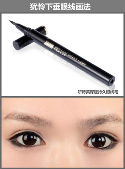 点评:这是这两年比较流行的一款比较无辜的眼线,也叫狗狗眼!一定要紧挨着睫毛根部来画,并且把睫毛和睫毛之间的空隙用眼线填满。